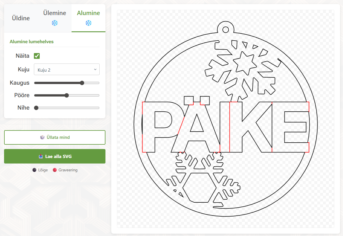 - SVG-faili allalaadimine: Kui oled oma mustri ja kuju valmis saanud, saad selle ühe klikiga alla laadida universaalses SVG-formaadis.